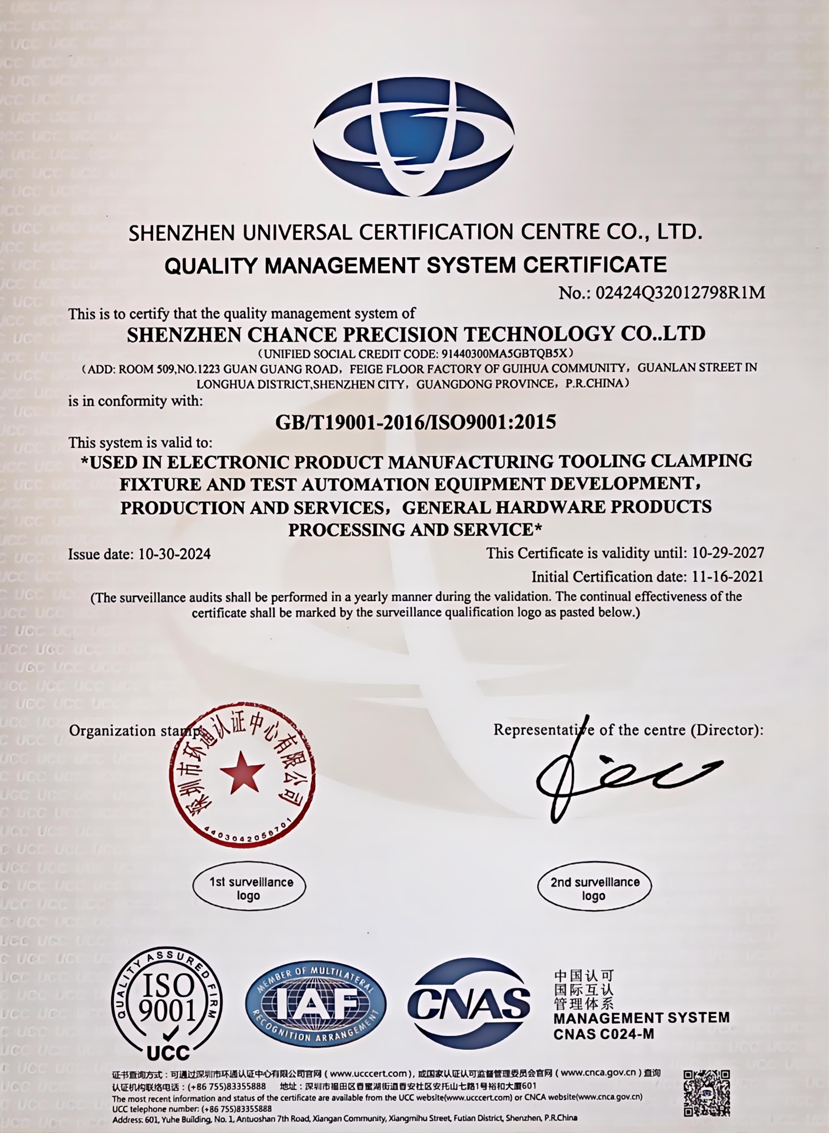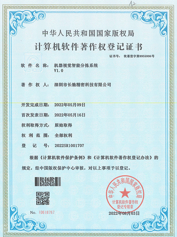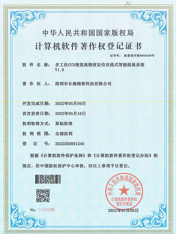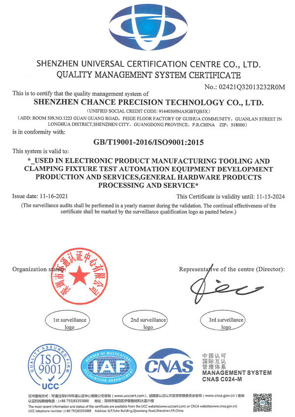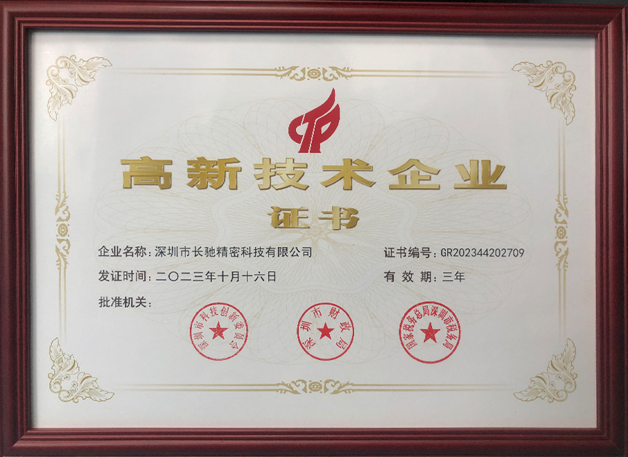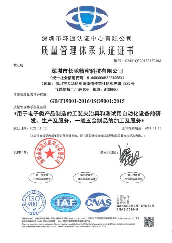 深圳市长驰精密科技有限公司成立于2020年,位于深圳市龙华区,现有面积4000余平方米。 是一家以研发生产非标自动化设备及夹治具为主的国家高新技术企业.并通过了ISO9001:2015国际质量管理体系认证,拥有多项自主研发的发明专利和实用新型专利。